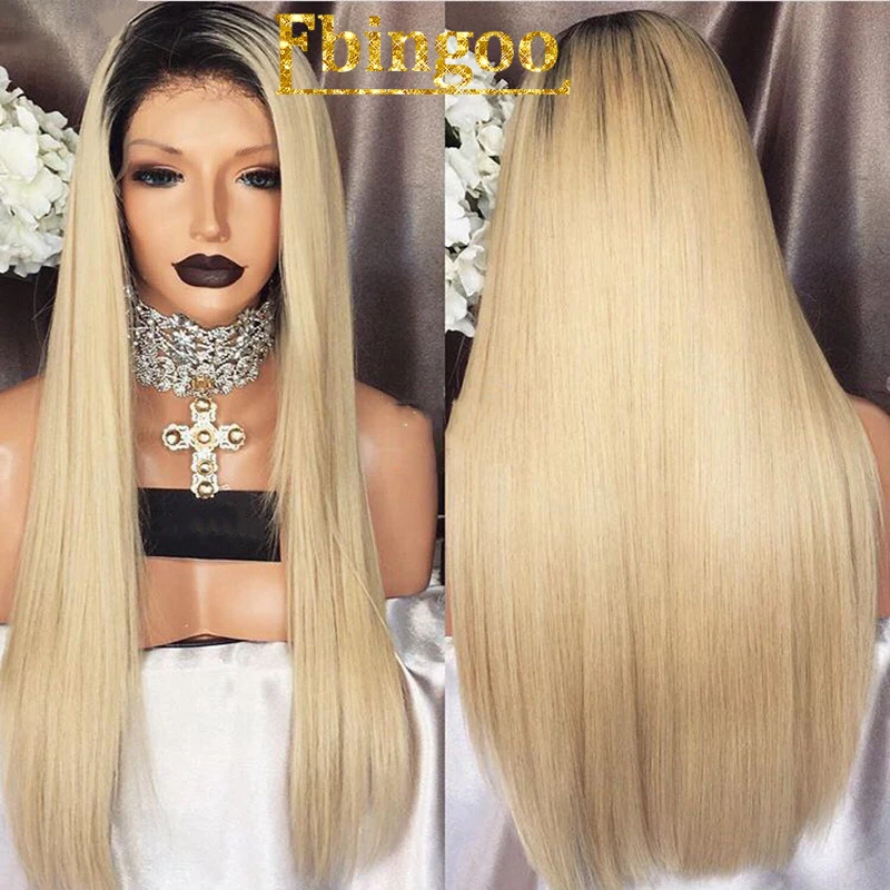 Get Ebingoo 26" High Temperature Fiber Black Ombre Blonde 2 Tones Natural Long Straight Synthetic Lace Front Wig For Women +Hair Cap