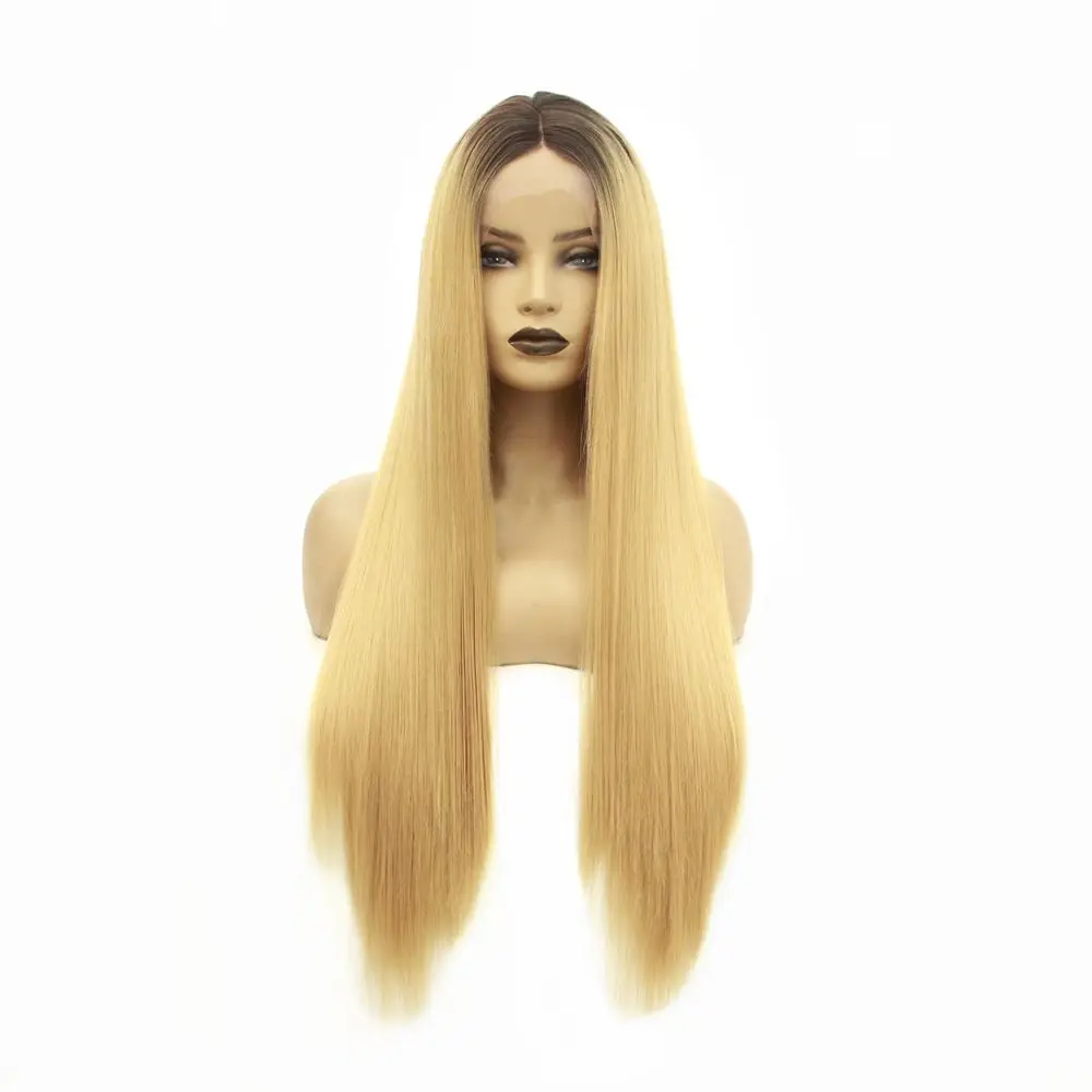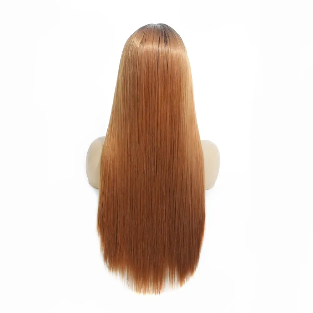 Wholesale Natural Hairline Brown Long Silky Straight Hair Dark Roots Heat Resistant Glueless Synthetic Lace Front Wigs for Black Women