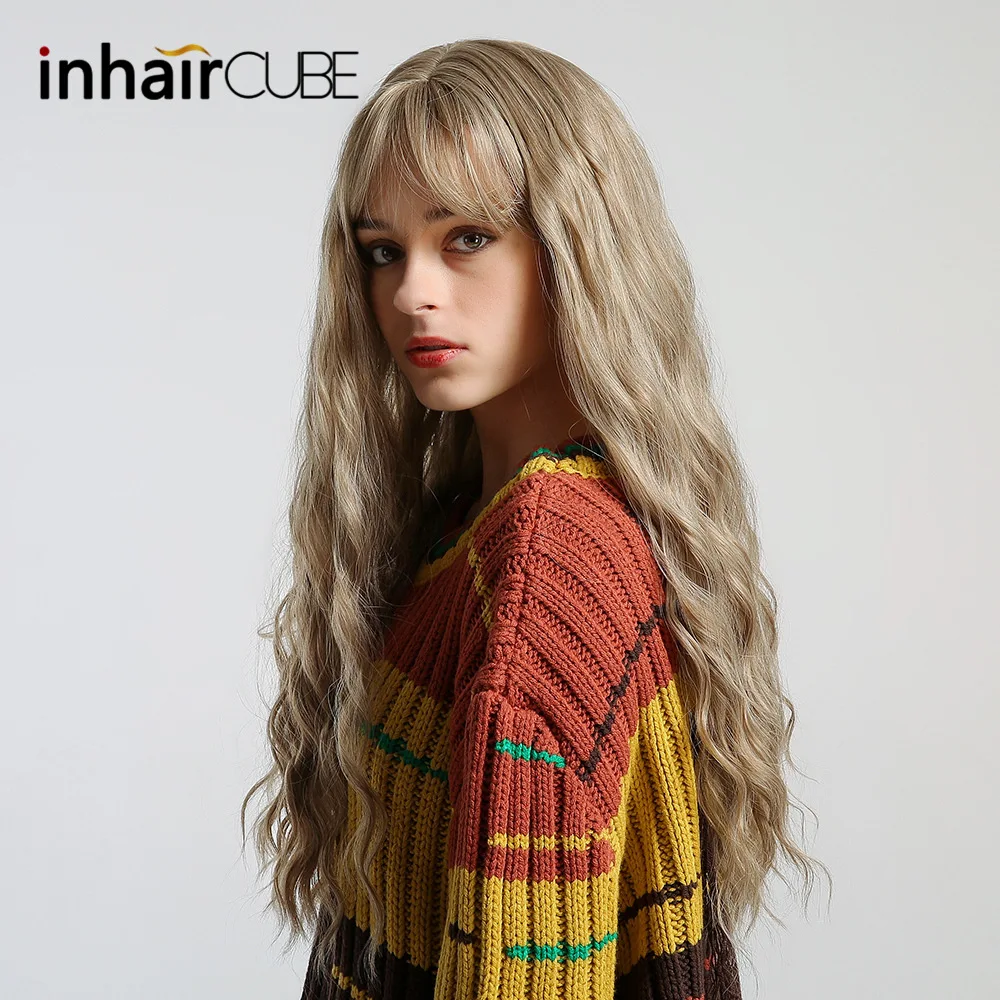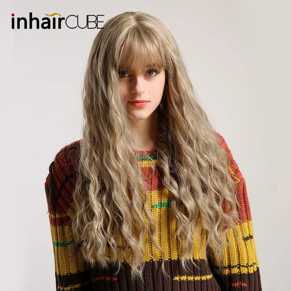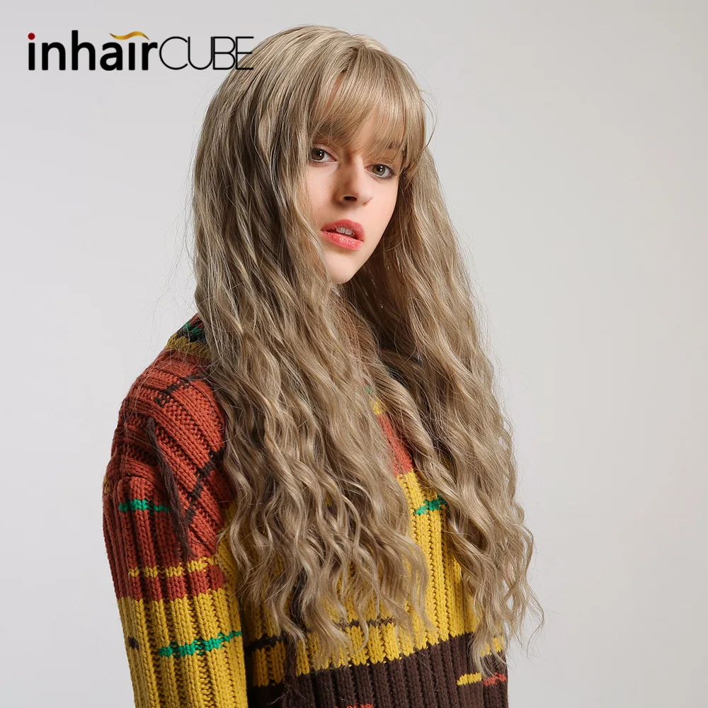 Limited Inhaircube Long Curly Blonde Brown Lolita Wigs with Bangs Half Synthetic Hair Piece For Black/White Womens Free Shipping