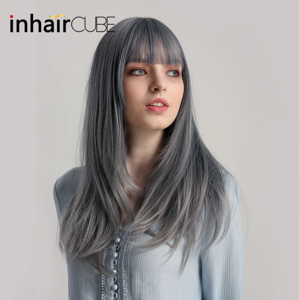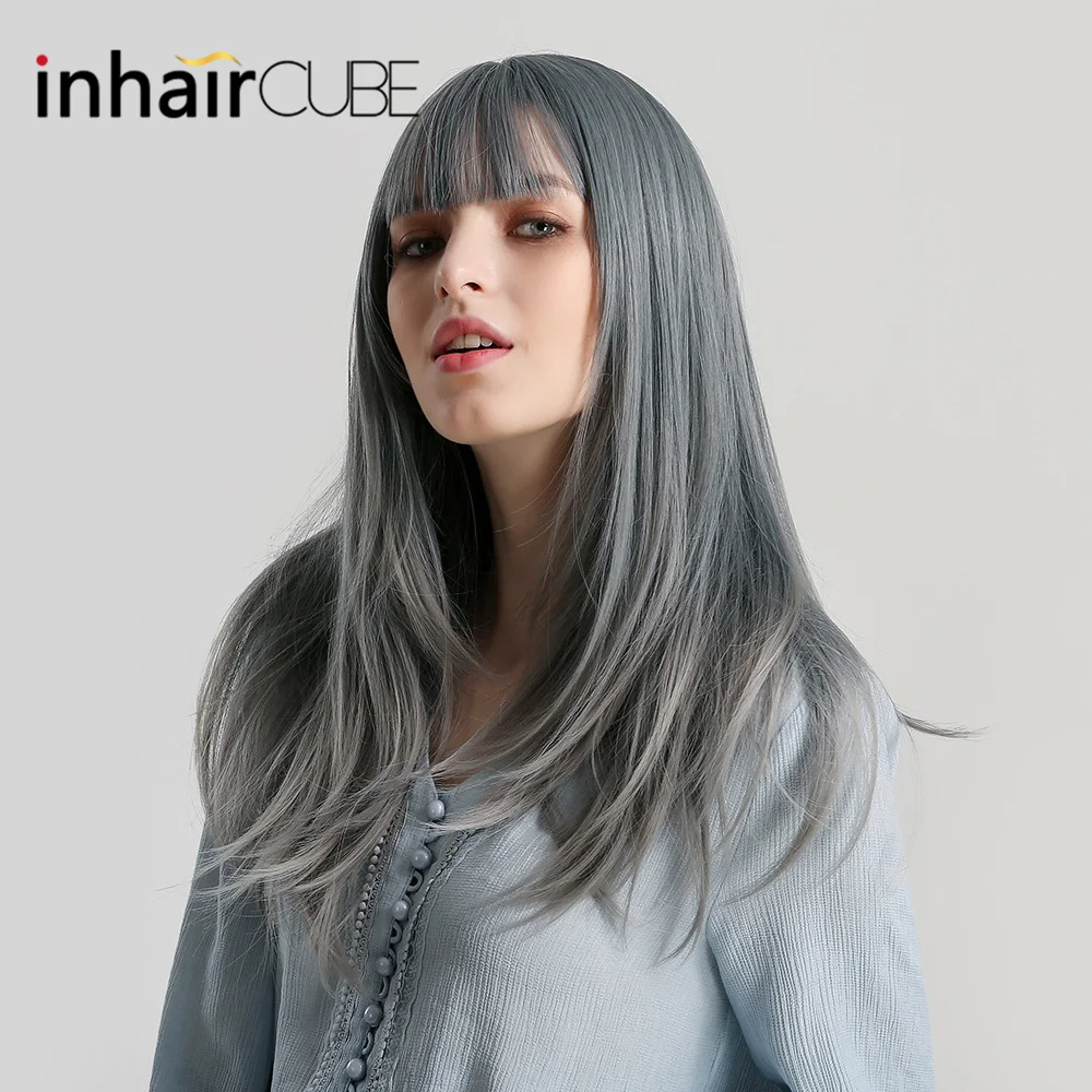 New Inhaircube Ombre Green Gray Blue Straight Synthetic Wig Mixed Natural Hair with Bangs Long Wigs for Women Lolita Wigs Free Gifts