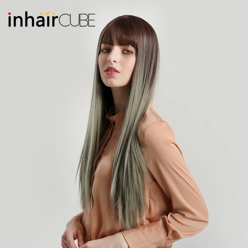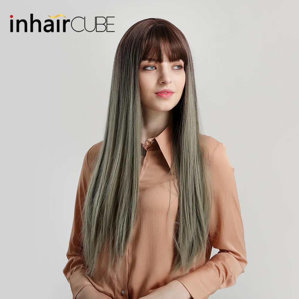 Buy Inhaircube Ombre Dark Root Green Lolita Wigs with Bangs For Women Naturals Heat Resistant Wig Synthetic Hair Free Gifts Shipping