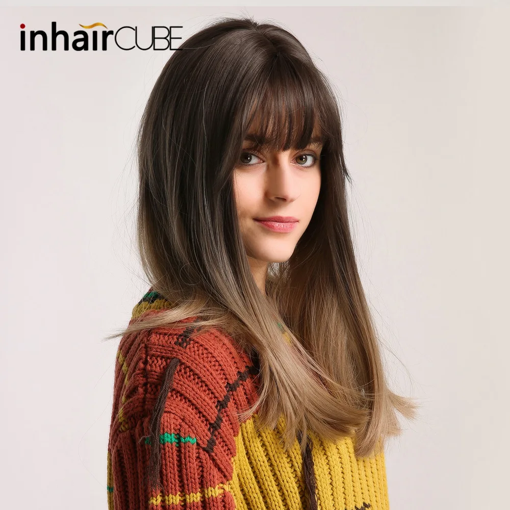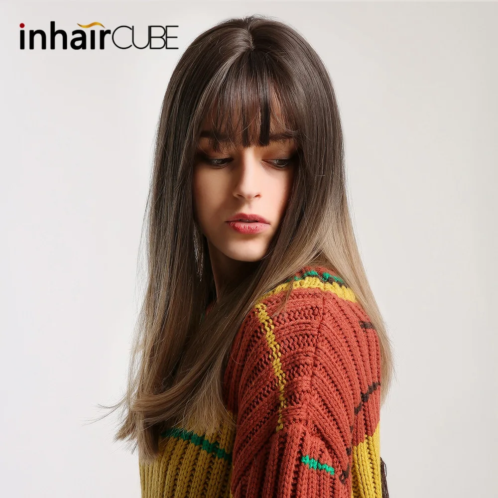 Special Product Inhaircube Ombre Straight Long Dark Brown Root Lolita Hair Wigs with Bangs Womens Half Synthetic Wig Real Scalp Free Shipping