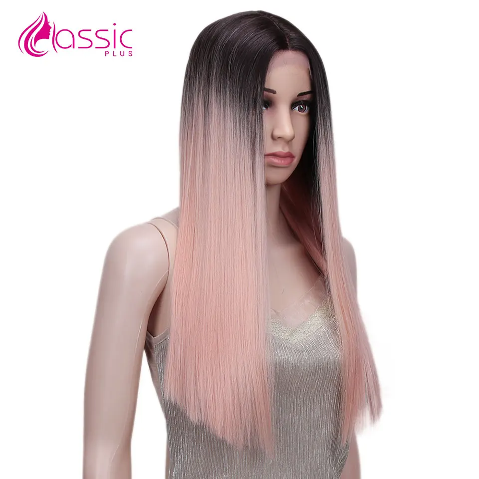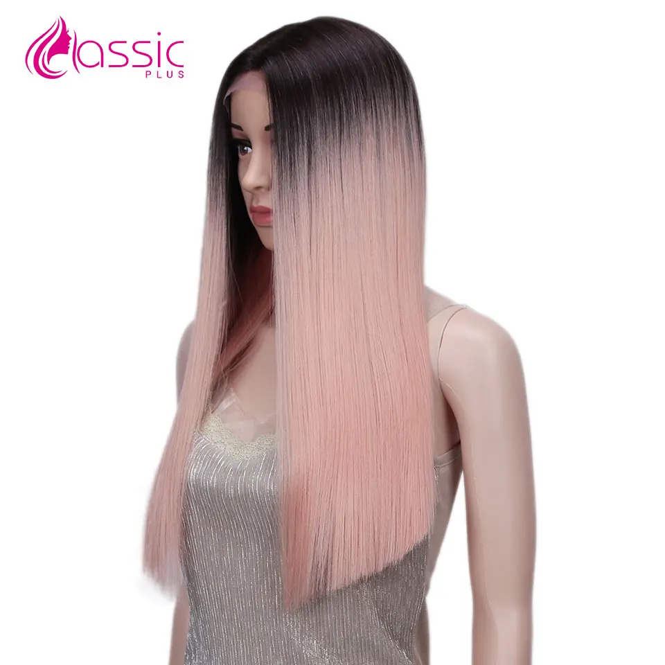 New Classic Plus Straight Synthetic Lace Front Wig Ombre Pink Blonde Colored Wigs For Women Blunt Cut Wig Heat Resistant Fiber Wig
